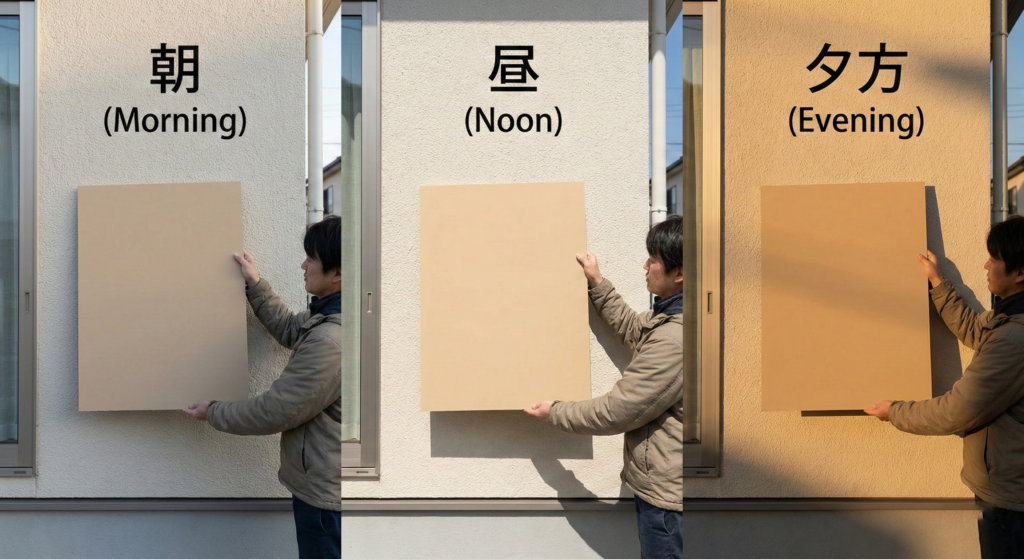 色選びで知っておいていただきたいのが、面積効果という現象です。小さな色見本と実際の外壁では、面積の違いで色の見え方が変わります。